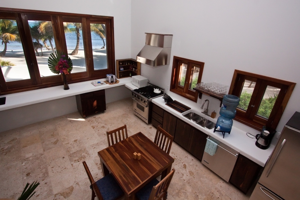 The villas of Azul are designed to marry the best of natural elements and materials with modern comforts and sophisticated conveniences. The beauty of the villas lay in their simplicity. Harsh corners are everywhere replaced by flowing lines. The floor plan is incredibly open… upon entering the villas, guests are greeted with 20-foot ceilings featuring 800lb beams of my lady wood. Throughout the villas, there is extensive use of the beautiful local hardwoods that have made Belize famous: all the windows and doors are hand crafted out of jabin… kitchen cabinets, bathroom vanities, beds and furniture are made of dark, luscious zericote… rooftop pergolas and railings are fashioned from young teak… all grown and cut in Belize. The villas also blur the lines between indoor and outdoor living. Enormous bi-fold windows open up both the living and dining areas to the ocean and tropical breeze. The entire rooftop of each villa is living area as well, with expansive lounging and dining spaces that offer spectacular views of the reef, sunsets and sky.